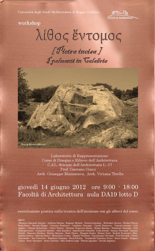 Nell’era del disegno informatico con la tecnica dell’incisione si propone agli studenti del primo anno del corso di Disegno e Rilievo del Laboratorio di Rappresentazione - un percorso a ritroso - . Una tecnica antica rivisitata e quasi riconquistata per un recupero della manualità che “traccia il segno“ prima sulla carta e poi sul rame.