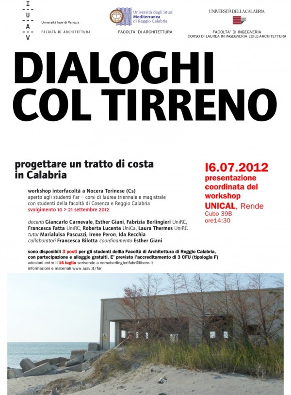 In collaborazione con IUAV e la Facoltà di Ingegneria/Corso di laurea in Ingegneria Edile-Architettura, la Facoltà di Architettura di Reggio Calabria promuove la partecipazione al workshop sui temi della riqualificazione ambientale e paesaggistica di un tratto di costa del Medio Tirreno, localizzato nel comune di Nocera Terinese, dal 10 al 21 settembre 2012. L’esperienza si concluderà con una mostra ed una pubblicazione guidata dallo Iuav.