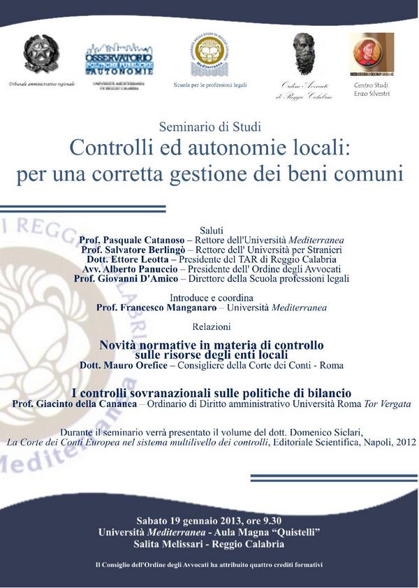 Il rapporto tra autonomie e autorità di controllo costituisce oggetto di un seminario organizzato dall'Università Mediterranea, nell'ambito delle attività della Scuola per le professioni legali, d'intesa con il Tribunale amministrativo regionale, l'Ordine degli avvocati, l'Università per stranieri e l'Osservatorio sulle politiche pubbliche per le autonomie.