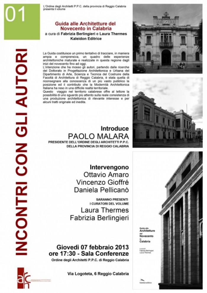 Domani 7 febbraio alle ore 17.30, presso sede dell'Ordine degli Architetti PPC di Reggio Calabria, si terrà la presentazione del volume "Guida alle Architetture del Novecento" a cura di Laura Thermes e Fabrizia Berlingieri, Kaleidon Editrice.