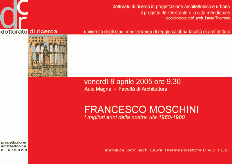 Venerdì 8 aprile alle ore 9.30 presso l'aula magna della facoltà di Architettura conferenza di Francesco Moschini: I migliori anni della nostra vita 1960-1980