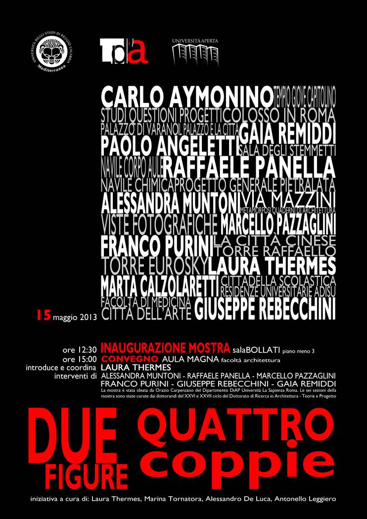 Il convegno del 15 maggio, ore 15.00, si occuperà della condizione attuale dell’architettura italiana a partire dall’analisi di un periodo, quello che va dal 1968 al 1980, in cui la cultura architettonica espressa dalle scuole italiane ebbe una notevole influenza a livello internazionale. In particolare si cercherà di comprendere il rapporto tra la situazione contemporanea della ricerca architettonica italiana in relazione ai nuovi scenari aperti dalla globalizzazione. Questa tematica sarà affrontata dagli architetti invitati, che proporranno, attraverso l’esposizione dei loro lavori, una testimonianza sul ruolo che essi hanno avuto in questa vicenda. La mostra Due figure e quattro coppie, organizzata dal Dottorato di Architettura dell’Università La Sapienza di Roma, verrà inaugurata in apertura del Convegno.