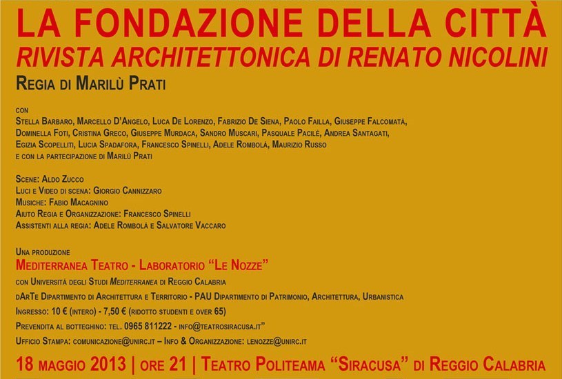 Il 18 maggio alle ore 21 al Teatro Politeama Siracusa, la compagnia del Laboratorio teatrale dell’Università “Mediterranea Teatro – Le Nozze” mette in scena “La Fondazione della Città” per la regia di Marilù Prati. Un divertissement ad alto tasso architettonico che ripercorre la storia delle fondazioni delle città dalla Torre di Babele ad Aldo Rossi, guidati da Alessandro Magno e dallo spirito dell’Architettura.