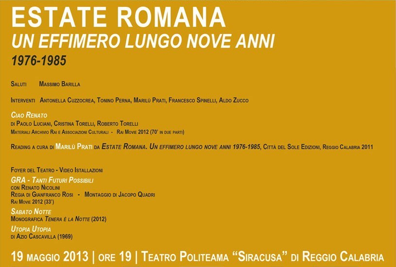 Domenica 19 maggio alle ore 19 al Teatro Politeama Siracusa presentazione di “Estate romana” (nella nuova edizione 2011 di Città del Sole ed.) con la lettura di Marilù Prati dell’introduzione scritta da Nicolini nel 2011 per ripercorrere insieme quella meravigliosa avventura proiettandola nel futuro.