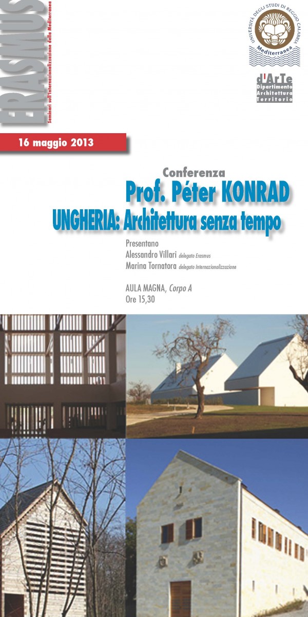 Nell'ambito dei seminari di Internazionalizzazione della Mediterranea il 16 maggio alle ore 15.30 presso l'Aula magna dell'ex Facoltà di Architettura, si terrà l'incontro "UNGHERIA: Architettura senza tempo" con il Prof. Peter Konrad.