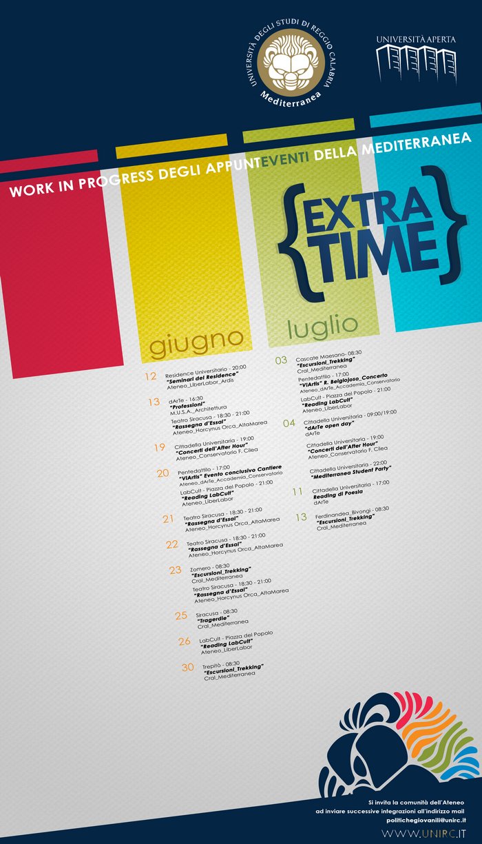 Per favorire il coinvolgimento dell’intera comunità della Mediterranea nasce: EXTRATIME “appunteventi della Mediterranea”, il calendario con tutti gli eventi promossi dagli studenti/per gli studenti.