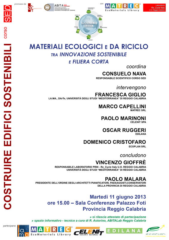 La Sala conferenze della Provincia di Reggio Calabria ospiterà l'11 giugno alle 15 un dibattito formativo ed informativo su “Materiali ecologici e da riciclo tra innovazione e filiera corta”.