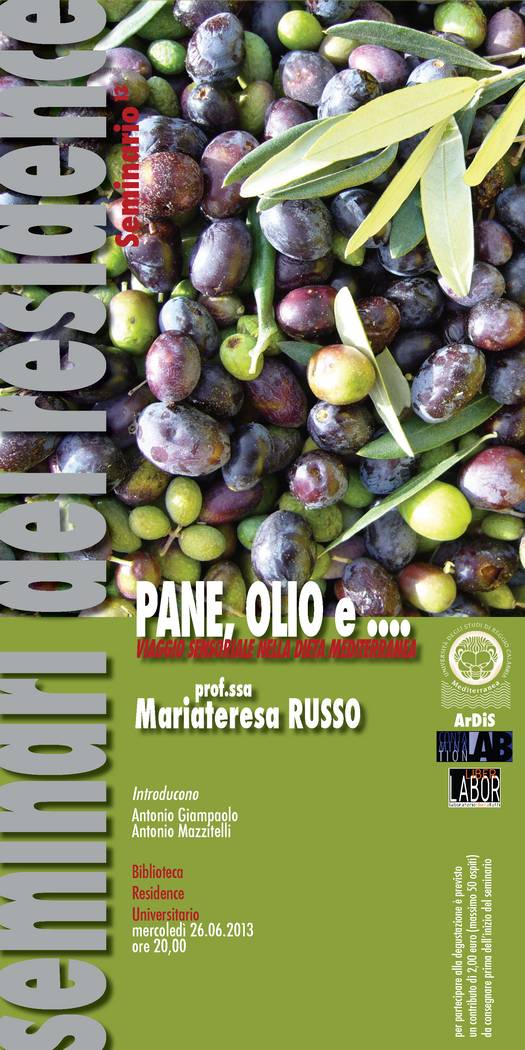 Mercoledì 26 giugno alle ore 20,00 si terrà, presso il Residence Universitario, il tredicesimo dei “Seminari del Residence” dal titolo: “PANE, OLIO e.... Viaggio sensoriale nella dieta mediterranea”.
