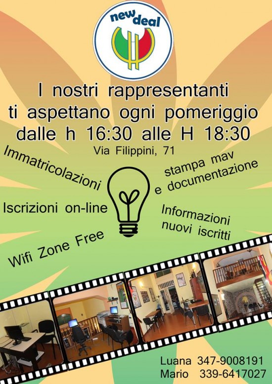 L’Associazione New Deal offre per l'anno accademico 2013-2014 assistenza agli studenti per le immatricolazioni, per le iscrizioni on-line agli anni successivi, per la stampa dei MAV, per la preparazione della documentazione da presentare in segreteria e per informazioni.