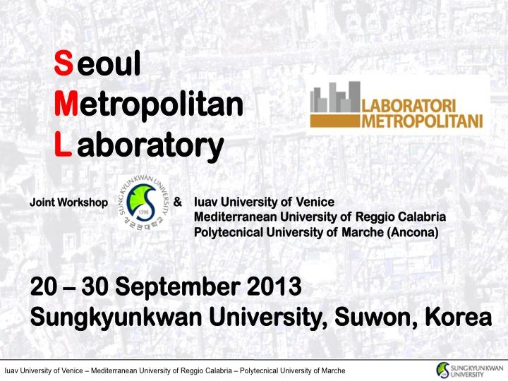 Presso la Sungkyunkwan University (SKKU) School of Architecture si sta svolgendo il Workshop di progettazione e viaggio studio “Laboratorio Metropolitano a Seoul” (18 settembre - 1 ottobre 2013), promosso dall'Università IUAV di Venezia con la partecipazione dell’Università Mediterranea di Reggio Calabria e il Corso di Laurea Ingegneria-Architettura dell’Università Politecnica delle Marche.