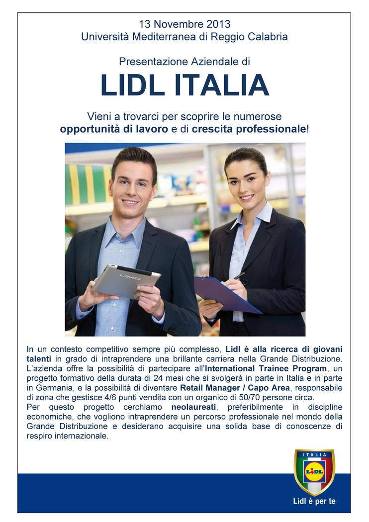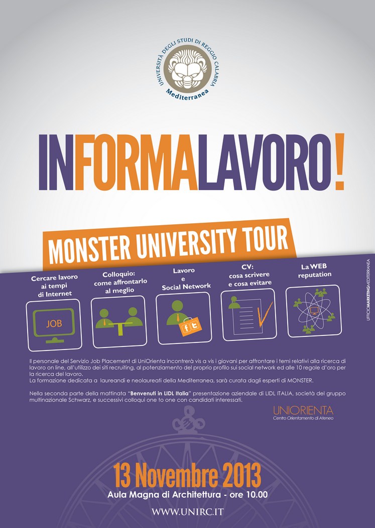 Il personale del Servizio Job Placement di UniOrienta incontrerà vis a vis i giovani per affrontare i temi relativi alla ricerca di lavoro on line, all’utilizzo dei siti recruiting, al potenziamento del proprio profilo sui social network ed alle 10 regole d’oro per la ricerca del lavoro.La formazione dedicata a laureandi e neolaureati della Mediterranea, sarà curata dagli esperti di MONSTER.Nella seconda parte della mattinata “Benvenuti in LIDL Italia” presentazione aziendale di LIDL ITALIA, società del gruppo multinazionale Schwarz, e successivi colloqui one to one con candidati interessati.