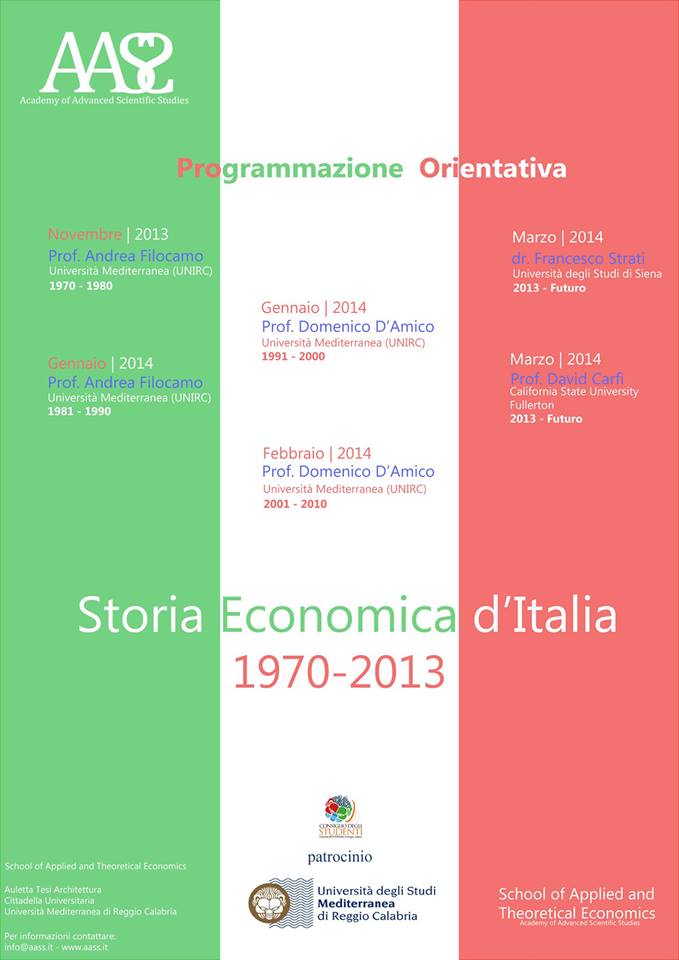 Tramite gli incontri “Storia Economica d’Italia 1970-2013” si vogliono ripercorrere gli eventi economici Italiani che hanno segnato il nostro Paese, la sua evoluzione.