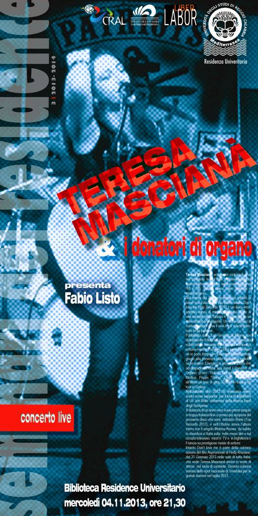 Mercoledì 4 dicembre i seminari del Residence ospitano il concerto di Teresa Mascianà & I donatori di organo, con la presentazione di Fabio Listo. Inizio alle 21.30 con partecipazione libera