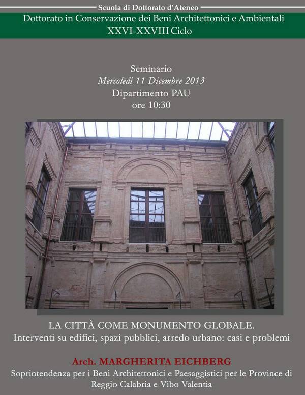 Mercoledi 11 dicembre alle ore 10.30 presso il Dipartimento PAU si svolge il seminario "La città come monumento globale. Interventi su edifici, spazi pubblici, arredo urbano: casi e problemi" con l'arch. Margherita Eichberg della Soprintendenza per i BB AA e PP per le province Reggio Calabria e Vibo Valentia.