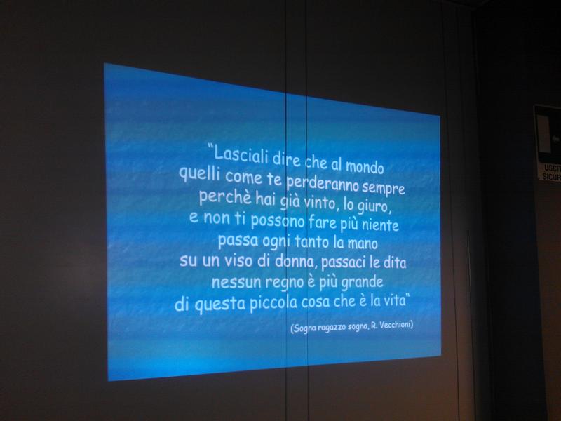 "Non serve strappare le pagine della vita, basta saper voltare pagina e ricominciare" si legge in una slide proiettata ad un corridoio gremito di giovani desiderosi di conoscere la storia di chi il fascino (ed il terribile inganno) della droga l’ha subito, ma da quel giogo ne è venuto fuori ed ora vuole solo “farsi la Comunità”.