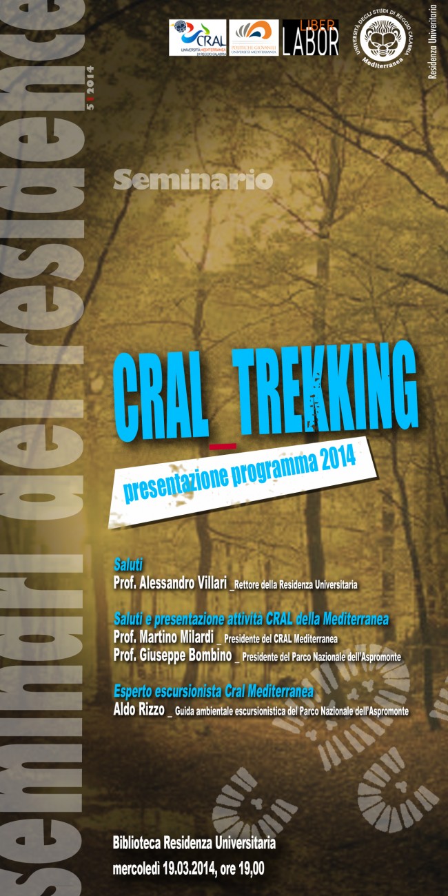 Il CRAL della Mediterranea presenterà il programma delle escursioni di trekking previste per l’anno 2014. Il prof. Martino Milardi, presidente del CRAL, illustrerà il panorama generale delle iniziative che ogni anno il CRAL organizza presso l’Università Mediterranea. Il prof. Giuseppe Bombino, presidente del Parco Nazionale dell’Aspromonte, porterà i saluti dell’Ente e il sig. Aldo Rizzo esporrà i dettagli e le specifiche del programma di trekking.