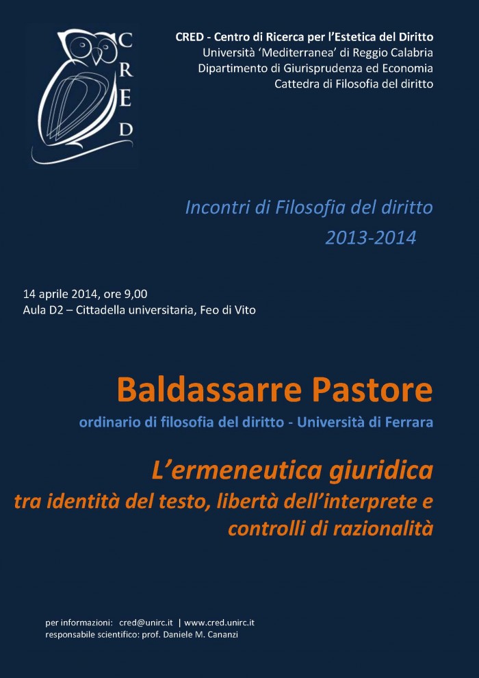 Prossimo appuntamento il 14 aprile nell'aula D2 del Lotto D della Cittadella Universitaria (Salita Melissari) alle ore 9,00, con Baldassarre Pastore, ordinario di filosofia del diritto all'Università di Ferrara, sul tema