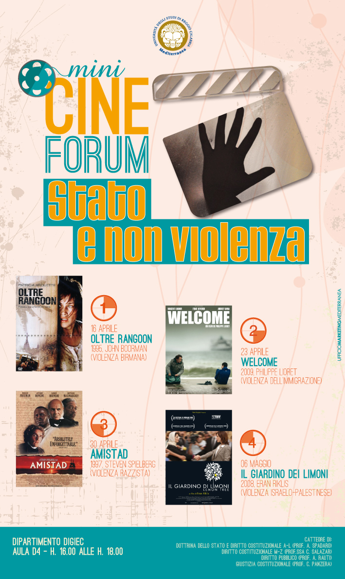 Le cattedre di Diritto costituzionale A-L e Dottrina dello Stato (prof. A. Spadaro), Diritto costituzionale M-Z (prof.ssa C. Salazar), Diritto pubblico (prof. A. Rauti) e Giustizia costituzionale (prof. C. Panzera) organizzano un mini ciclo di proiezioni cinematografiche per riflettere e discutere sul tema "Stato e non violenza".