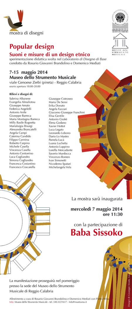 - Mercoledì 7 maggio - ore 11:30 - Inaugurazione della mostra Popular design. Suoni e misure di un design etnico, presso il Museo dello Strumento Musicale, viale Genoese Zerbi (pineta), Reggio Calabria. La mostra, che rimarrà aperta dal 7 al 15 maggio 2014, esporrà i rilievi e di disegni elaborati nel Laboratorio di Disegno di Base condotto da Rosario Giovanni Brandolino e Domenico Mediati presso l’Università Mediterranea di Reggio Calabria. Gli strumenti rilevati appartengono alla collezione del Museo dello Strumento Musicale di Reggio Calabria. L’inaugurazione avverrà alla presenza del musicista maliano, griot e polistrumentista Baba Sissoko e del direttore del dipartimento dArTe Gianfranco Neri.