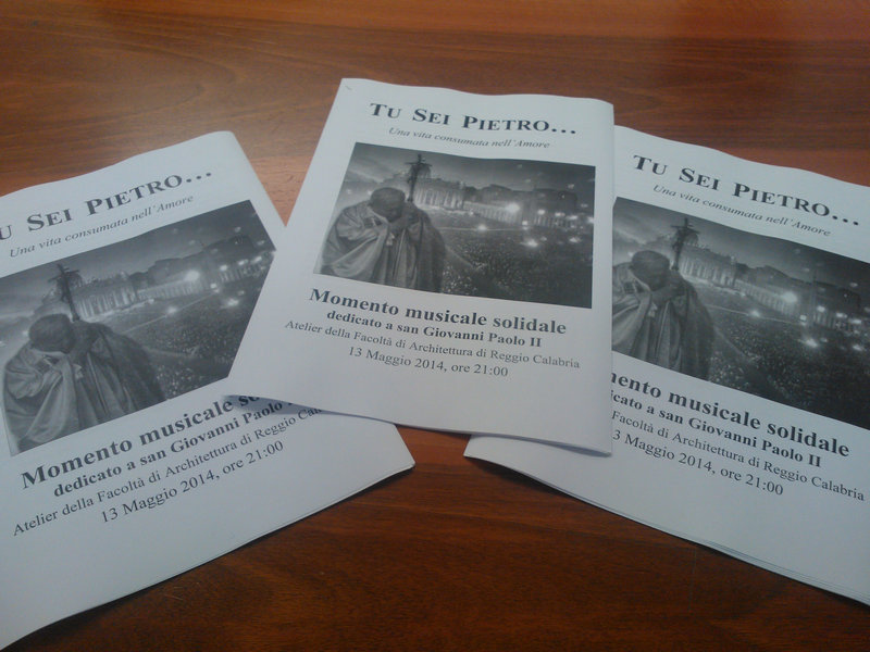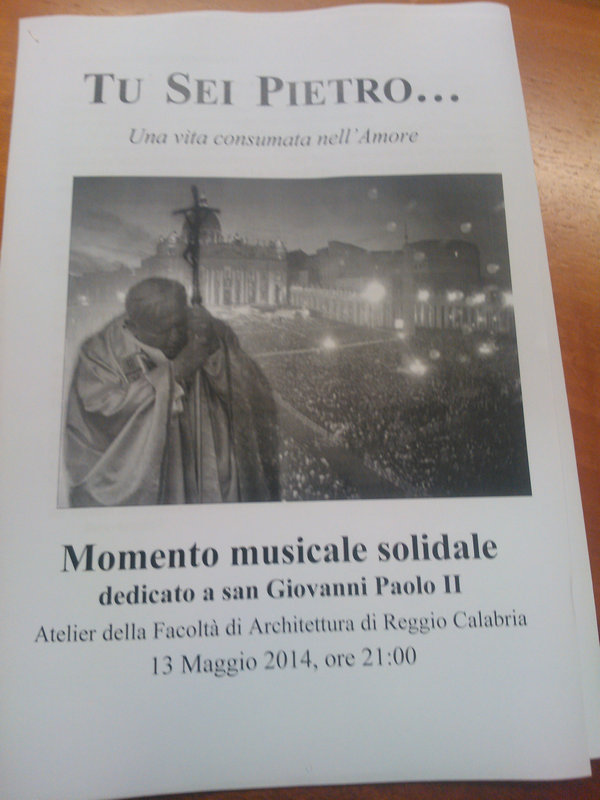 Il Movimento Contaminiamo i Saperi, operante all'interno dell'Università Mediterranea, in collaborazione con il Centro Monoriti, con l'Associazione di promozione sociale "Pagliacci ClanDestini" e con una serie di altri associazioni, enti e volontari, ha organizzato un concerto di musica sacra, dal titolo "Tu sei Pietro...Una vita consumata nell'Amore", dedicato a San Giovanni Paolo II (in occasione della sua canonizzazione e della ricorrenza della data in cui - nel 1981 - subì l'attentato che lasciò il mondo col fiato sospeso).