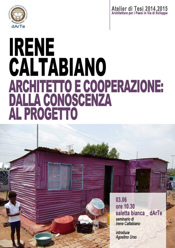 Nell’ambito delle attività dell’Atelier di Tesi “Architettura per i paesi in via di sviluppo”, attivato dal Dipartimento dArTe, martedì 3 giugno alle ore 10,30 nella Saletta Bianca del dipartimento si svolgerà il seminario dell’arch. Irene Caltabiano dal titolo “ARCHITETTO E COOPERAZIONE: DALLA CONOSCENZA AL PROGETTO”.