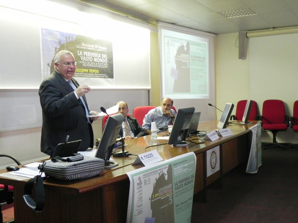 Si è concluso Mercoledì 28 maggio il ciclo di seminari “Lavorare è un’impresa”, promosso dalla Biblioteca del Dipartimento di Agraria dell’Università Mediterranea di Reggio Calabria. Il seminario finale ha avuto per tema “La periferia del vasto mondo: l’impresa del sud e le nuove sfide dell’internazionalizzazione”. Protagonisti ne sono stati due relatori di eccezione, entrambi del Ministero dello Sviluppo Economico: il dott. Giuseppe Tripoli, Direttore Generale per le politiche di internazionalizzazione e la promozione degli scambi, e il dott. Romano Tiozzo, Rappresentante delle PMI italiane presso la Commissione Europea.