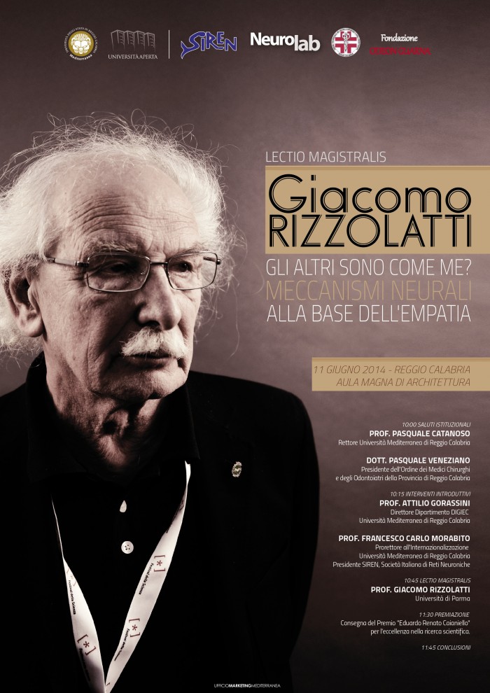 Il professor Giacomo Rizzolatti ha ricevuto a Reggio Calabria il Premio “E.R. Caianiello” (2013) per l’Eccellenza nella ricerca scientifica sulle Reti Neurali. La cerimonia di consegna si è svolta l'11 giungo alle ore 10.00 presso l'Aula magna di Architettura della Mediterranea.