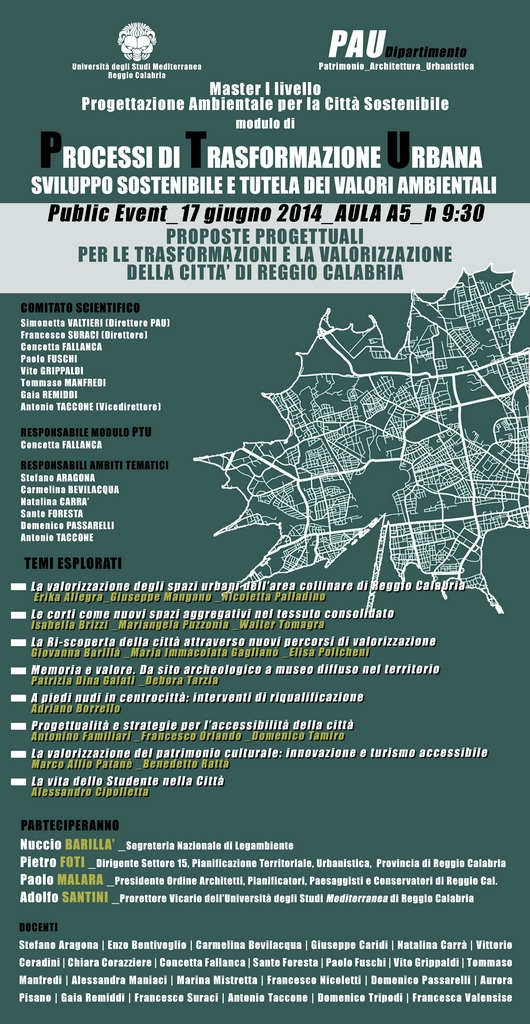 Il prossimo martedì 17 giugno, alle ore 9.30 in aula A5 di Architettura, si terrà il seminario/mostra “Proposte progettuali per le trasformazioni e la valorizzazione della città di Reggio Calabria”, evento conclusivo del modulo Processi di trasformazione urbana – sviluppo sostenibile e tutela dei valori ambientali del Master di primo livello “Progettazione ambientale per la città sostenibile”, istituito presso l’Università Mediterranea, su proposta del Dipartimento Patrimonio, Architettura, Urbanistica (PAU).