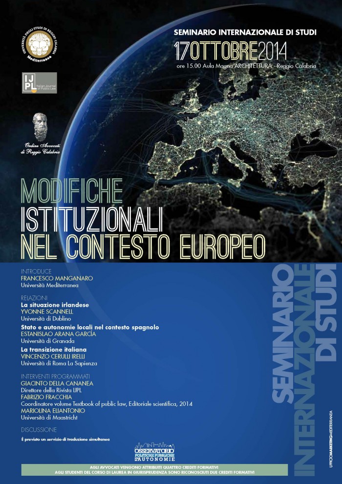 Il seminario internazionale di studi Modifiche istituzionali nel contesto europeo è organizzato dalla Cattedra di Diritto amministrativo dell’Università degli Studi Mediterranea di Reggio Calabria in collaborazione con la rivista telematica di Diritto pubblico Italian Journal of public law, la prima rivista on line di Diritto pubblico in lingua inglese.