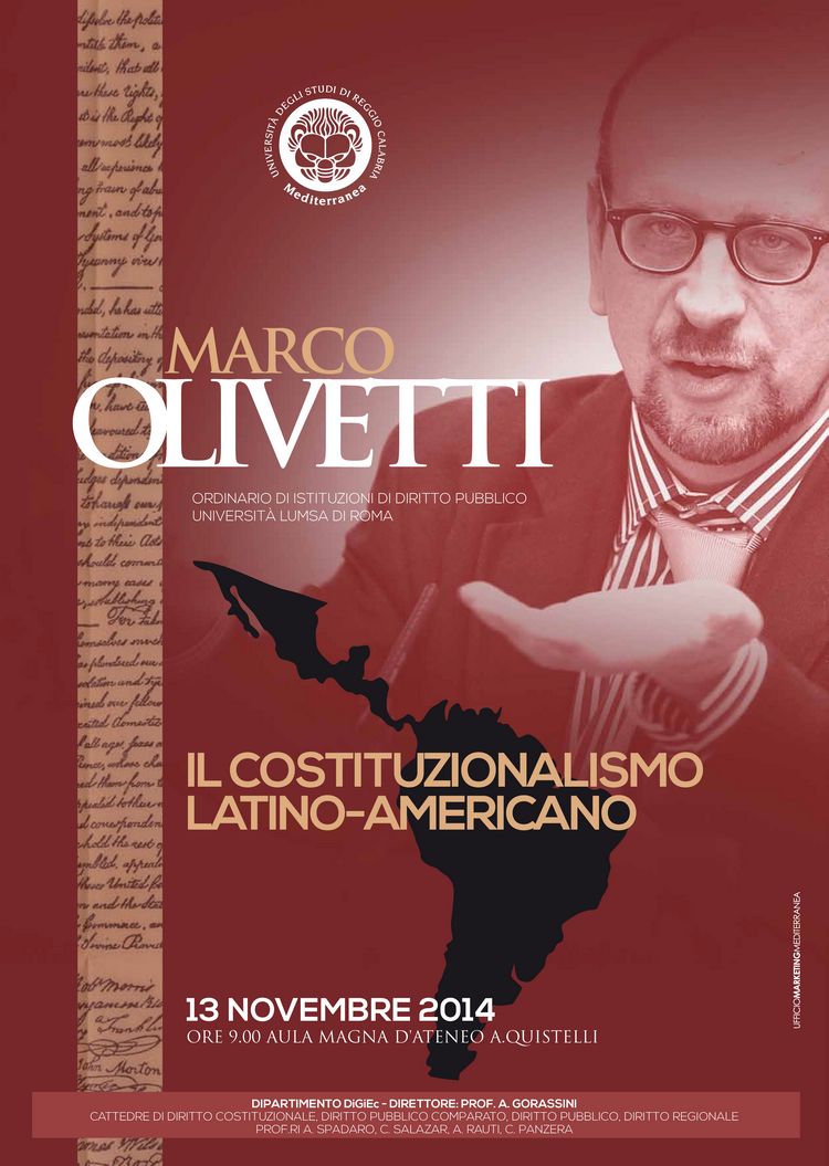 Giovedì 13 novembre 2014 alle ore 9.00, nell’Aula Magna d’Ateneo “A. Quistelli”, il prof. Marco Olivetti (ordinario di Istituzioni di Diritto pubblico presso l’Università Lumsa di Roma) terrà una lectio magistralis sul tema“Il costituzionalismo latino-americano”, nell’ambito dei corsi di Diritto costituzionale, Diritto pubblico comparato, Diritto pubblico e Diritto regionale (prof.ri A. Spadaro, C. Salazar, A. Rauti, C. Panzera)”.