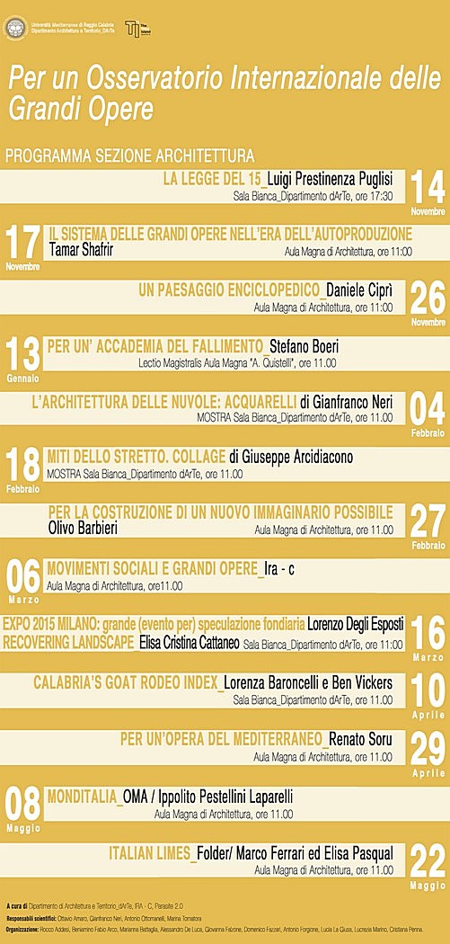 Il ciclo di seminari è incentrato sul tema “Per un osservatorio internazionale sulle grandi opere” partirà il 14 novembre con l’intervento di Luigi Prestinenza Puglisi, saggista, critico e storico dell'architettura.
