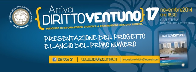 Dopo il successo riscosso dal numero pilota della rivista, distribuito lo scorso maggio, e il rilevante numero di contatti ottenuti dalla nostra pagina facebook, che offre spunti giuridici quasi giornalieri, “Diritto21” celebra l’uscita del primo numero presentandosi al pubblico con un’iniziativa che avrà luogo lunedì 17 novembre, dalle ore 18:30, presso la caffetteria del plesso di Architettura dell’Università Mediterranea.