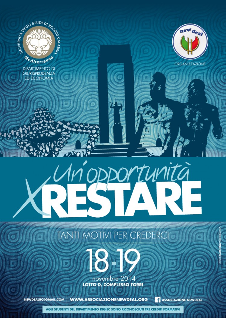 Il progetto “Un’opportunità per restare” nasce dall’idea dell’associazione studentesca universitaria New Deal di offrire un’opportunità di confronto agli studenti calabresi con il mondo del lavoro e imprenditoriale circostante e di valorizzazione delle risorse e delle eccellenze locali, vista la frequente richiesta del mondo giovanile di relazionarsi con esperti disponibili a dare consigli e valutare le loro idee in un clima animato e motivante. Questo è reso possibile anche grazie al coinvolgimento in prima linea delle principali associazioni giovanili della provincia di Reggio Calabria, unite per fronteggiare il triste fenomeno della “fuga di cervelli” calabresi, gettando le basi per la formulazione di una politica volta a investire nei nostri punti di forza, sia come capitale umano sia come capitale economico, per farli diventare responsabilmente protagonisti dello sviluppo socio-economico calabrese. Riteniamo che tali tematiche siano frequentemente discusse a livello convegnistico-seminariale ma poco affrontate in ambito operativo. Proponiamo, quindi, di iniziare a ridurre la distanza tra teoria e pratica in due giorni di multiattività per costruire il nostro futuro indicando gli indirizzi strategici e le azioni da compiere. Non è più possibile assistere inermi all’oblio culturale ed alla deriva economica che caratterizza il nostro territorio da troppo tempo, essere spettatori di un’asfissia creativa che opprime le nuove generazioni, le quali individuano la migrazione verso le regioni del nord ed i paesi virtuosi dell’Unione Europea la panacea di ogni male, unica soluzione possibile per poter raggiungere gratificazioni professionali ed umane. A tal fine, abbiamo considerato utile optare per la realizzazione di un collegamento e confronto fra le principali realtà positive dell’area metropolitana (Università Mediterranea, Terzo Settore, imprenditoria giovanile), perché crediamo che fare rete possa generare proposte e offerte di lavoro innovative secondo le attuali e future richieste del mercato.
