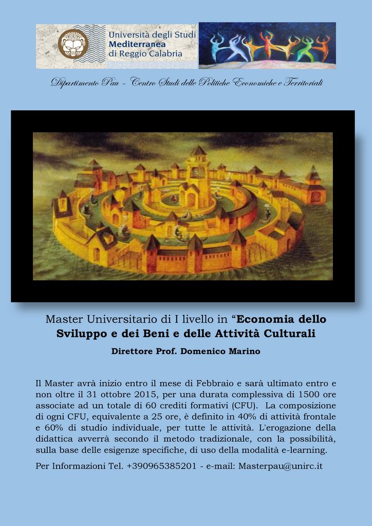 Sono riaperti i termini di scadenza per la partecipazione al bando di selezione per il Master Universitario di I Livello in “Economia della sviluppo e dei beni e delle attività culturali”.