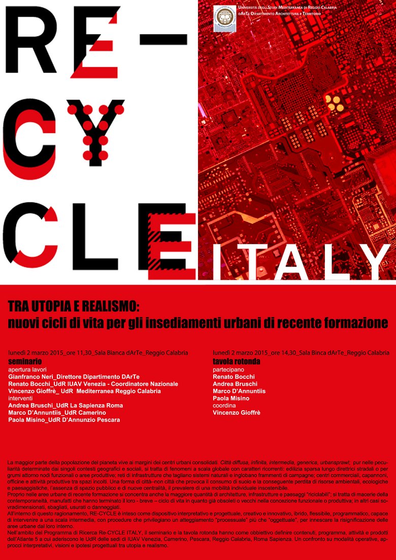 La maggior parte della popolazione del pianeta vive ai margini dei centri urbani consolidati. Città diffusa, infinita, intermedia, generica, urbansprawl; pur nelle peculiarità determinate dai singoli contesti geografici e sociali, si tratta di fenomeni a scala globale con caratteri ricorrenti: edilizia sparsa lungo direttrici stradali o per grumi attorno nodi funzionali o aree produttive; reti di infrastrutture che tagliano sistemi naturali e inglobano frammenti di campagne; centri commerciali, capannoni, officine e attività produttive tra spazi incolti. Una forma di città–non città che provoca il consumo di suolo e la conseguente perdita di risorse ambientali, ecologiche e paesaggistiche, l’assenza di spazio pubblico e di nuove centralità, il prevalere di una mobilità individuale insostenibile. Proprio nelle aree urbane di recente formazione si concentra anche la maggiore quantità di architetture, infrastrutture e paesaggi “riciclabili”; si tratta di macerie della contemporaneità, manufatti che hanno terminato il loro - breve – ciclo di vita in quanto già obsoleti o vecchi nella concezione funzionale o produttiva; in altri casi sovradimensionati, sbagliati, usurati o danneggiati. All’interno di questo ragionamento, RE-CYCLE è inteso come dispositivo interpretativo e progettuale, creativo e innovativo, ibrido, flessibile, programmatico, capace di intervenire a una scala intermedia, con procedure che privilegiano un atteggiamento “processuale” più che “oggettuale”, per innescare la risignificazione delle aree urbane dal loro interno. Nell’ambito del Programma di Ricerca Re-CYCLE ITALY, il seminario e la tavola rotonda hanno come obbiettivo definire contenuti, programma, attività e prodotti dell’Atlante 5 a cui aderiscono le UdR delle sedi di IUAV Venezia, Camerino, Pescara, Reggio Calabria, Roma Sapienza. Un confronto su modalità operative, approcci interpretativi, visioni e ipotesi progettuali tra utopia e realismo.
