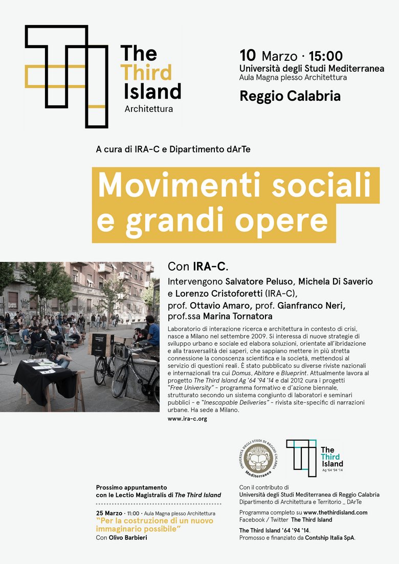 Laboratorio di interazione ricerca e architettura in contesto di crisi, nasce a Milano nel settembre 2009. Si interessa di nuove strategie di sviluppo urbano e sociale ed elabora soluzioni, orientate all’ibridazione e alla trasversalità dei saperi, che sappiano mettere in più stretta connessione la conoscenza scientifica e la società, mettendosi al servizio di questioni reali. È stato pubblicato su diverse riviste nazionali e internazionali tra cui Domus, Abitare e Blueprint. Attualmente lavora al progetto The Third Island Ag ‘64 ‘94 ‘14 e dal 2012 cura i progetti “Free University” - programma formativo e d’azione biennale, strutturato secondo un sistema congiunto di laboratori e seminari pubblici - e “Inescapable Deliveries” - rivista site-specific di narrazioni urbane. Ha sede a Milano.