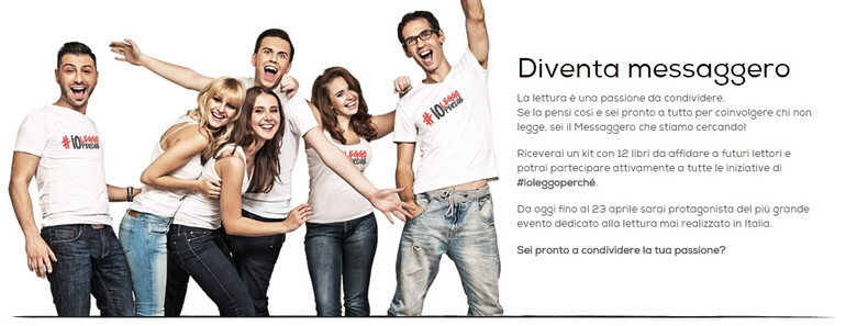 Una grande iniziativa nazionale di promozione del libro e della lettura rivolta ai non lettori, fondata sulla passione dei lettori di ogni età ed estrazione che mobiliterà i lettori di tutta Italia trasformandoli in veri e propri Messaggeri “pronti a tutto” per sensibilizzare il 23 aprile, Giornata mondiale del libro e del diritto d’autore, chi non legge o legge poco.
