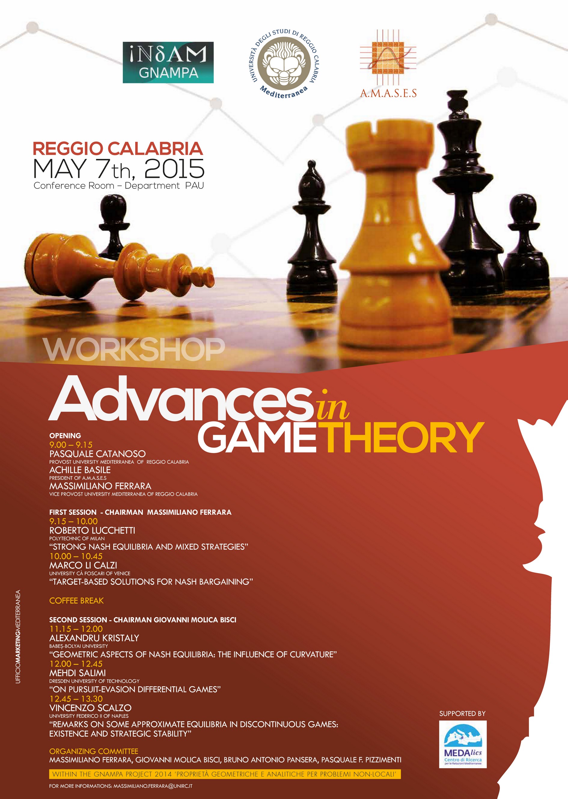I temi che saranno oggetto delle cinque relazioni invitate, toccheranno argomenti di frontiera che spaziano dai giochi differenziali, agli Equilibri di Nash, a soluzioni di Tipo” Nash Bagaining”, ai riflessi geometrici del problema di Nash, all’analisi di equilibri approssimati in giochi discontinui.