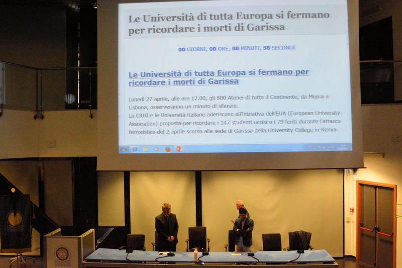 In adesione all’iniziativa promossa dall’EUA (European University Association), il Rettore invita la Comunità universitaria a ritrovarsi il prossimo lunedì 27 aprile, alle ore 11.30, nell’Aula Magna “A.Quistelli” della Cittadella Universitaria, per osservare alle ore 12, insieme ad altri 800 Atenei del Continente europeo, un minuto di silenzio in ricordo dei 147 Studenti barbaramente trucidati e dei 79 feriti durante l’attacco terroristico del 2 aprile scorso alla sede di Garissa della University College in Kenya.