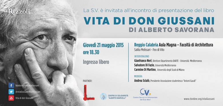 Giovedì 21 maggio 2015 alle ore 18:30, presso l'Aula Magna d'Architettura, si svolge l'incontro di presentazione del libro di Alberto Savorana "Vita di Don Giussani" (Ed. BUR 2014 - Rizzoli 2013).
