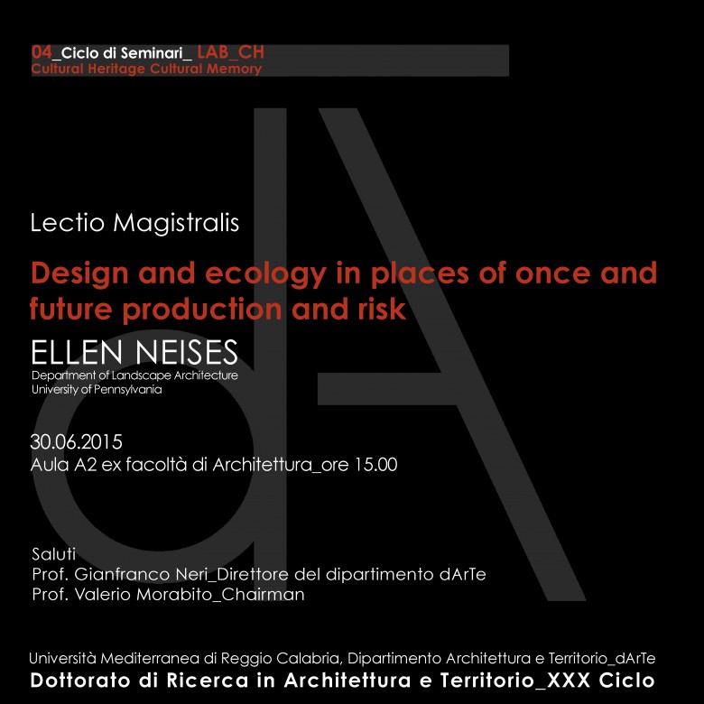 Continuano i cicli di seminari svolti per la Scuola di dottorato del dipartimento dArTe. Per il laboratorio “Cultural Heritage Cultural Memory” si terrà la lectio magistralis della professoressa Ellen Neises dal titolo: “Design and ecology in places of once and future production and risk”, alle ore 15:00 del 30 giugno nell’aula A2 di Architettura.