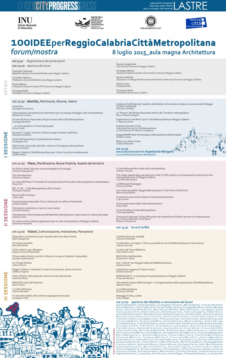 Il LASTRE, Laboratorio Integrato per l’Area dello Stretto per lo sviluppo del territorio del Dipartimento PAU dell’Università Mediterranea, e l’Ordine degli Architetti PPC della Provincia di Reggio Calabria promuovono, a cura di Concetta Fallanca e Paolo Malara, il Forum 100IDEE per Reggio Calabria Città Metropolitana che si terrà il prossimo 8 luglio nell'Aula magna di Architettura, in occasione del primo Festival delle Città Metropolitane (Reggio Calabria, 16/18 luglio 2015).