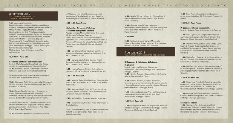 “Le arti per lo spazio sacro nell’Italia meridionale tra Otto e Novecento” è il titolo dell’importante convegno di studi che vedrà relazionare a Vallelonga, nelle giornate dell’8 e del 9 ottobre prossimo, docenti e studiosi provenienti da tutta la Regione, e non solo, che si confronteranno in merito alle problematiche artistiche dell’Ottocento e la conoscenza non ancora esaustiva delle figure che dominano il panorama culturale a cavallo tra i due secoli nell’Italia meridionale.