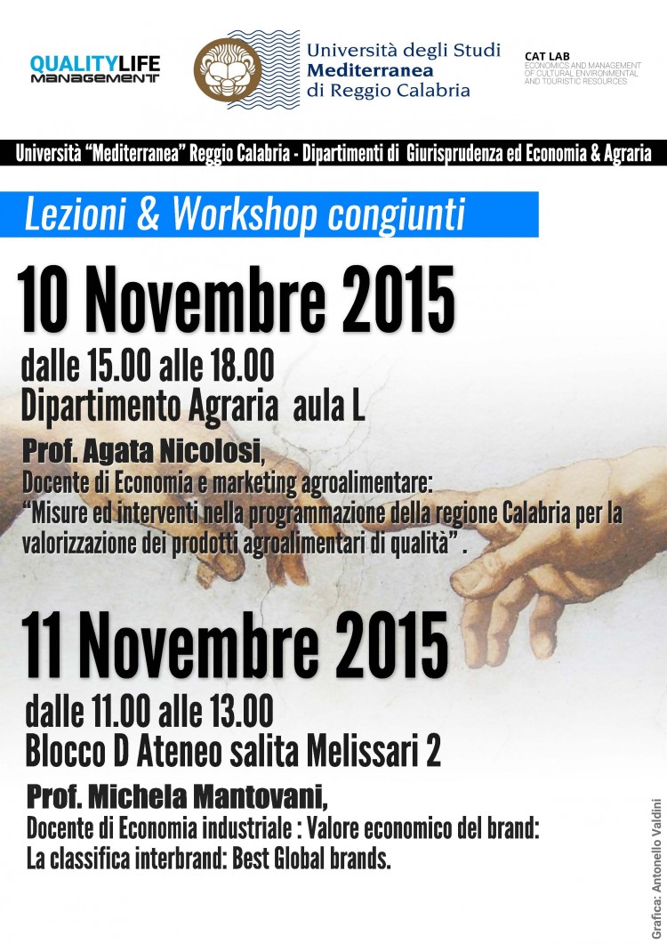 Nell’ambito del corso di Economia Industriale tenuto dalla prof. Michela Mantovani, nei giorni 10 e 11 novembre si terranno in via sperimentale, workshop e lezioni congiunte fra i Dipartimenti di Giurisprudenza ed economia ed Agraria. La tematica comune dei due corsi sono le industrie culturali e le eccellenze del made in Italy con particolare riferimento all’agroalimentare di eccellenza della regione Calabria.