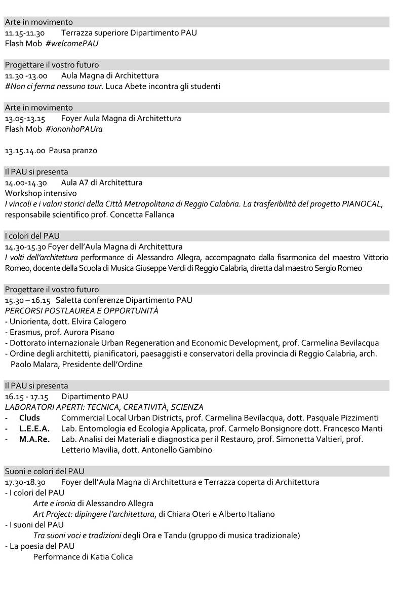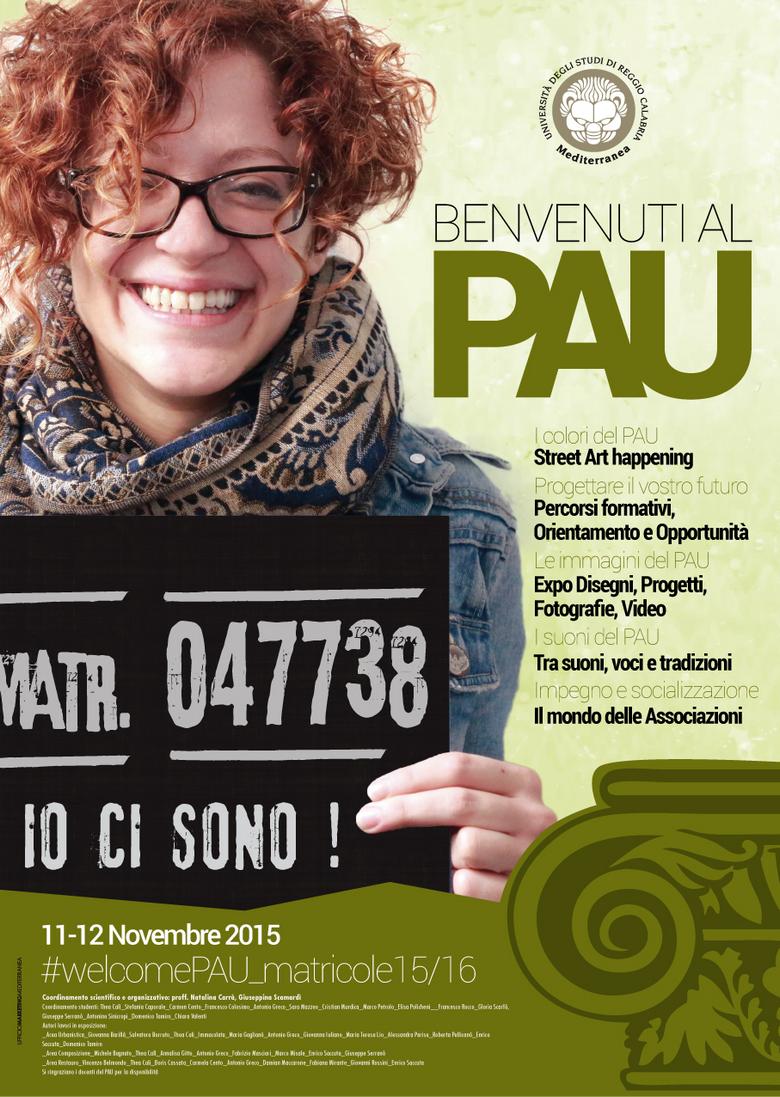 Il Dipartimento PAU - Patrimonio, Architettura, Urbanistica - dell’Università Mediterranea di Reggio Calabria nei giorni 11-12 novembre 2015 darà il benvenuto alle sue matricole con una manifestazione che coinvolgerà docenti e studenti dei Corsi di laurea in Scienze dell’Architettura L-17 e Architettura-Restauro LM-4 e che sarà aperta all’intero Ateneo.