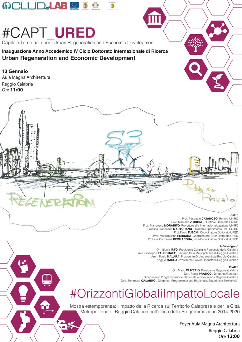 Il prossimo 13 gennaio alle ore 11:00 si terrà presso l'Aula Magna di Architettura dell’Università Mediterranea di Reggio Calabria, l’inaugurazione d’anno accademico del IV Ciclo del Dottorato di ricerca internazionale Urban regeneration and economic development con a seguire la mostra estemporanea #CAPT_URED.