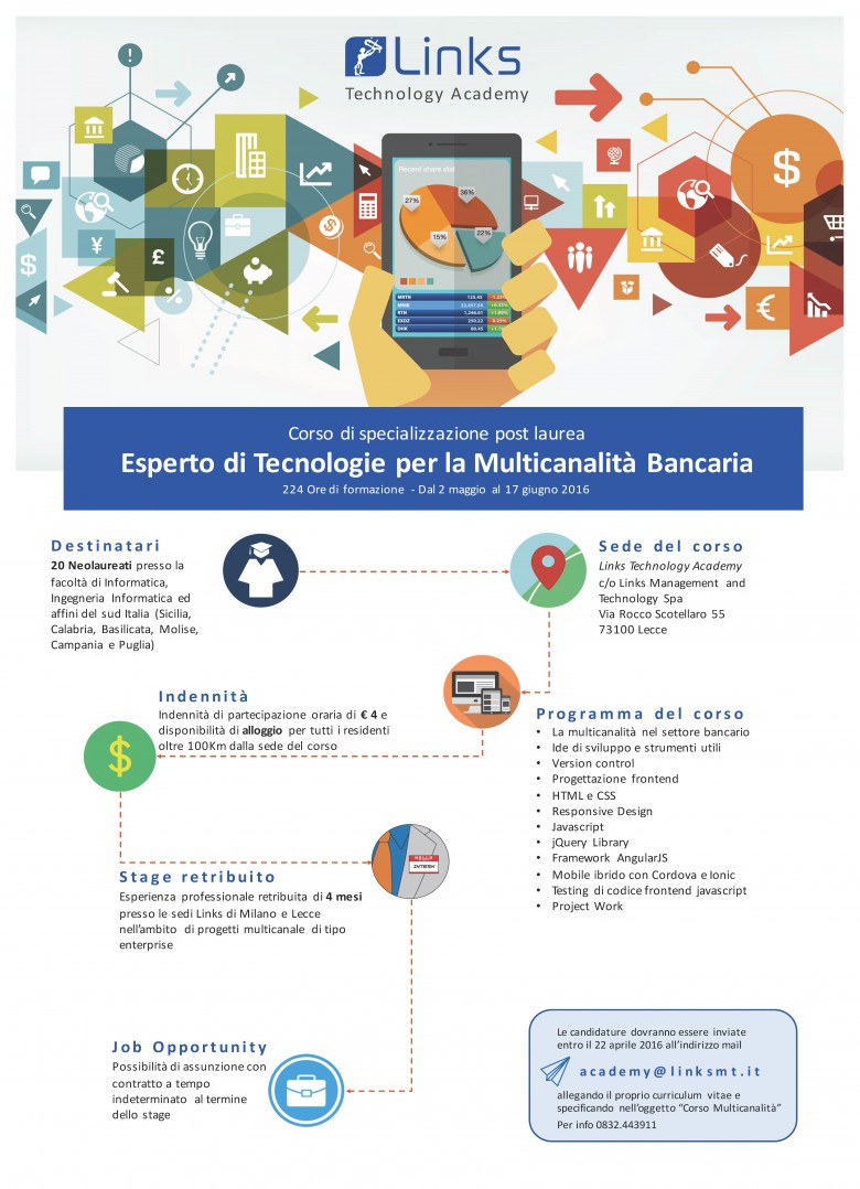 Links Management and Technology S.p.a. invita i neolaureati in Ingegneria Informatica ed affini - Sud Italia - a iscriversi al corso di specializzazione post laurea "Esperto di Tecnologie per la Multicanalità Bancaria" che prevede 224 ore di formazione - dal 2 maggio al 17 giugno 2016, presso la sede di Lecce.