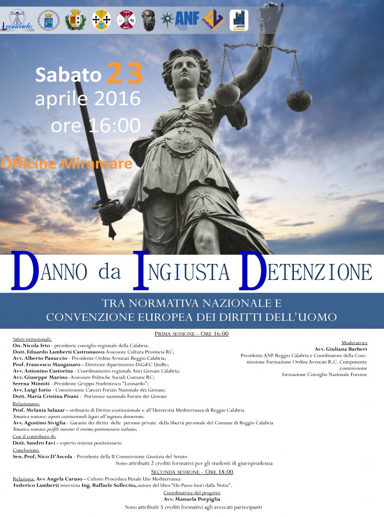 L'associazione Leonardo di intesa con l'Anf sezione di Reggio Calabria, l'Anci Giovane, la Consulta Provinciale degli studenti ed il Forum Nazionale dei Giovani, con il patrocinio del Comune di Reggio Calabria, la Provincia di Reggio Calabria e la Presidenza del Consiglio Regionale della Calabria organizza un seminario dal titolo: Il Danno da Ingiusta Detenzione - Tra Normativa Nazionale e Convenzione Europea dei Diritti dell'uomo.
