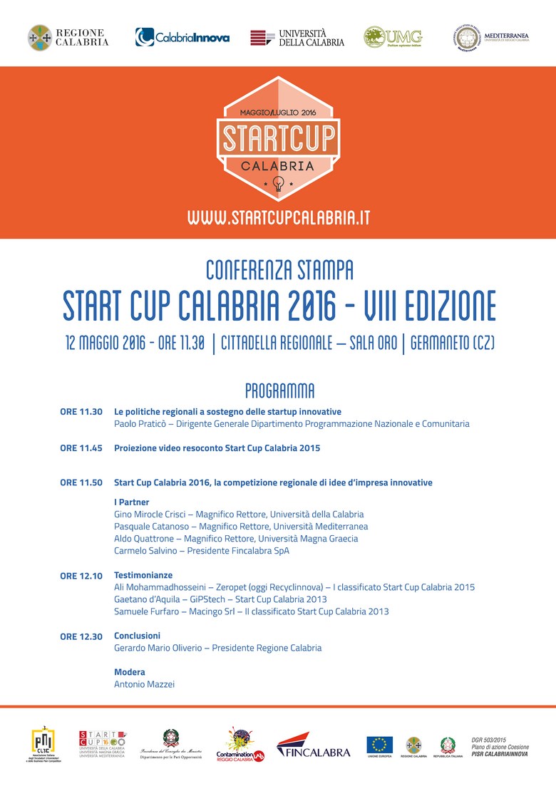 Sempre giovedì 12 maggio, alle ore 11.30, nella Sala Oro della Cittadella Regionale di Germaneto (Cz), avrà luogo la conferenza stampa di lancio della VIII edizione della Start Cup Calabria (SCC), la business plan competition promossa da Università della Calabria, Università Magna Græcia, Università Mediterranea e Fincalabra attraverso CalabriaInnova.