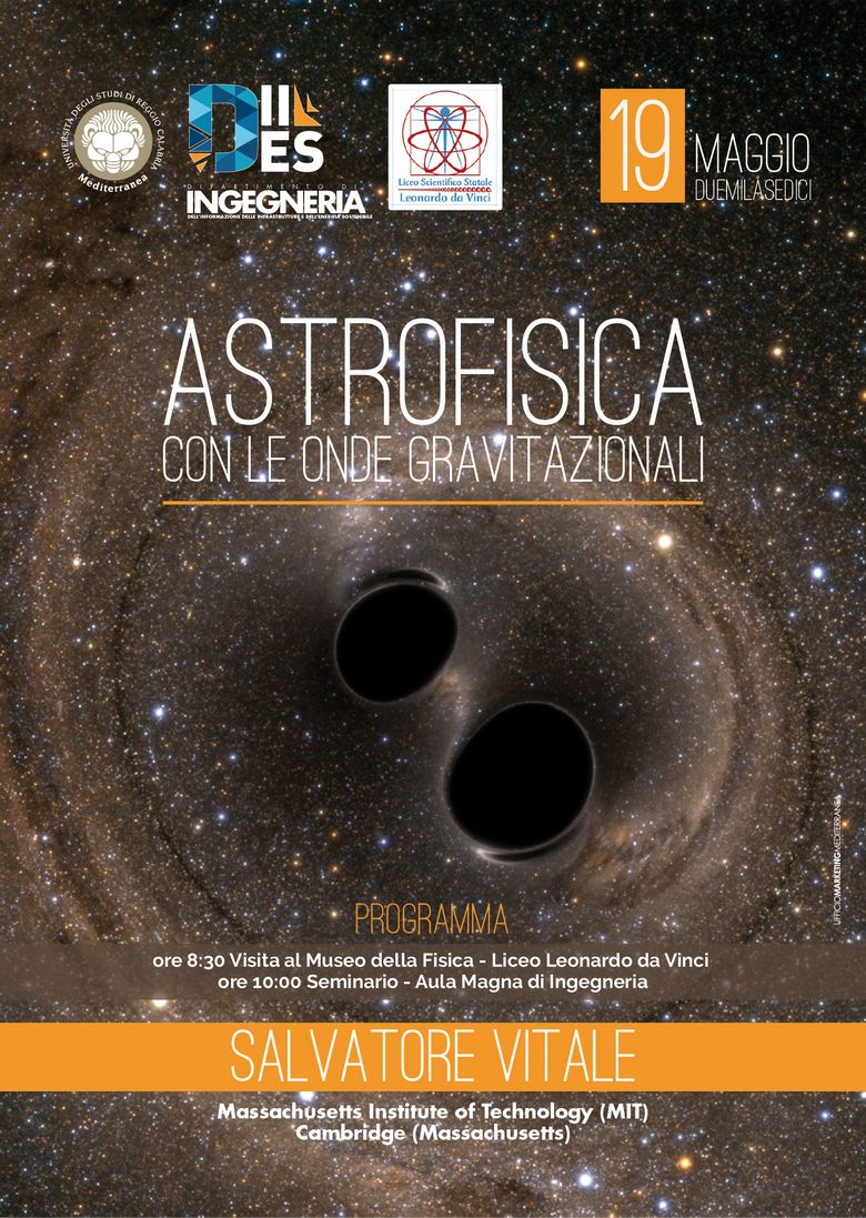 Alle 10.00, nell’Aula Magna di Ingegneria dell’Università Mediterranea, Salvatore Vitale del Massachusetts Institute of Technology (MIT) di Cambridge (Massachusetts) terrà il seminario “Astrofisica con le onde gravitazionali”, al quale parteciperanno tutte le quinte classi del liceo da Vinci.